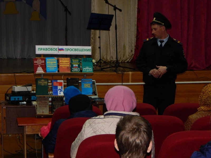 25 апреля в рамках декады правовых знаний в ДК был приглашен участковый инспектор Болховских Константин Сергеевич, который провел беседу с учащимися школы, участниками художественной самодеятельности ДК. Ребята задавали интересующие их вопросы, на которые получали ответы участкового. Была оформлена книжная выставка на правовую тему "ПРАВОВОЕ ПРОСВЕЩЕНИЕ", которая не осталась без внимания.