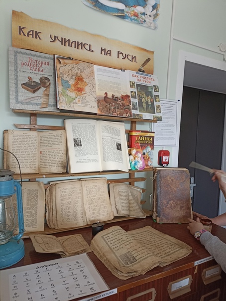 А еще посетили библиотеку, где оформлена выставка"Как учились на руси" и познакомились с древними книгами, писаниями, смогли потрогать перо с чернильницей.