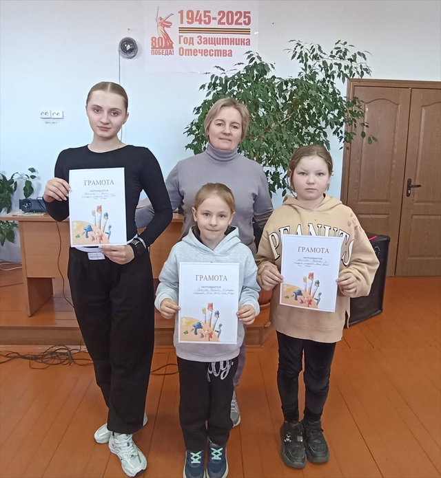 Рисунки лучших были отмечены грамотами, это Суханова Дарина, Филатова Вероника и Филатова Ульяна. Все участники получили сладкие призы. Некоторые из работ приняли участие в Народеой акции "Рисуем Победу".